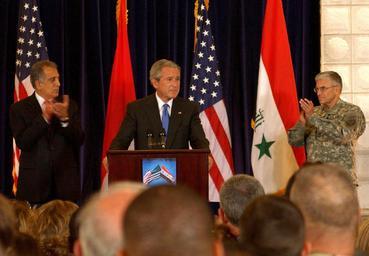Keywords: Khalilzad-Bush-Casey in 2006.jpg Zalmay Khalilzad left U S Ambassador to Iraq and Gen George Casey right commanding general Multinational Forces-Iraq applaud President George W Bush as he commends U S and coalition forces for their continuing efforts in Iraq June 13 2006 at a former presidential palace of Saddam Hussein in Baghdad's International Zone U S Navy photo by Petty Officer 1st Class Darrell Crandall http //www defenselink mil/homepagephotos/homepagephotos aspx month 200606 U S Department of Defense direct link to image http //www defenselink mil/dodcmsshare/homepagephoto 5C2006-06 5Chires_060613-N-0000X-001a jpg here 2006-06-13 Petty Officer 1st Class Darrell Crandall PD-USGov-Mil-Navy Zalmay Khalilzad George W Casey Jr George W Bush in 2006