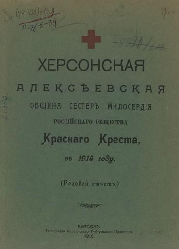 | Keywords: Kherson Alex. Community Report 1914 (01) - Cover.jpg en Kherson Alexeevskaya Community of Sisters of Mercy by Russian Red Cross Society at 1914 year Year Report Title cover ru Хе сонская Алексеевская община сесте милосе дия Росссийского общества К асного К еста в 1914 году Годовой отчёт Обложка 1915 http //www mycity kherson ua/gallery/thumbnails php album 34 author Custom license marker 2013 01 08 PD-old-70 Uploaded with UploadWizard Kherson Alexeevskaya Community of Sisters of Mercy 1915 books |