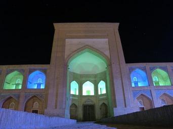 Keywords: khiva night medrese lighting colorful mood uzbekistan