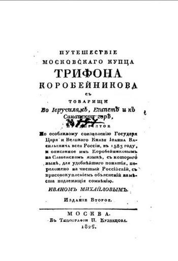 Keywords: Khojdenie Korobeinikov 1826.jpg ru Титульный лист «Хожения» Т ифона Ко обейникова издания 1826 года http //vk com/wall-35220730_4963 Author 1826 PD-old-100 Khojdenie