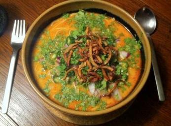 Keywords: Khow suey.jpg en Bowl of Khow Suey own Tizbad2k 2010-10-25 Cc-zero Noodle soups in Myanmar