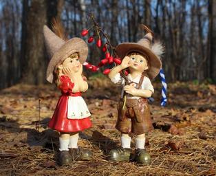 Keywords: kids girl boy forest elf cap get lost the loss of couple two hat apron shorts surprise cute friends brother sister costume autumn leaves boy and girl park figures figurine students hunting hunter barberry berry