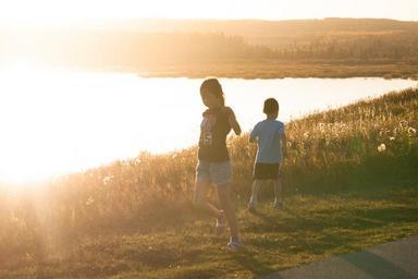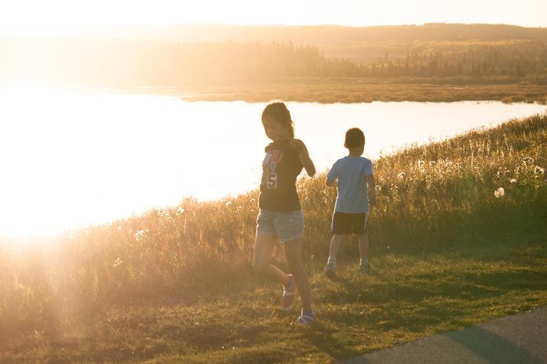 Keywords: kids play lakeside sunset fall dawn happy fun golden outline canada