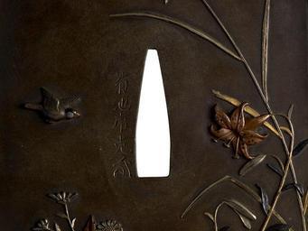 | Keywords: Kikuchi Tsunekatsu - Tsuba with a Sparrow and Autumn Foliage - Walters 51258 - Mark A.jpg A small sparrow is depicted in flight at the left side of this tsuba A stalk of pampas grass dominates the right side and small chrysanthemums are along the both Although normally a late summer flower lilies are shown at the right and on the reverse early-mid 18th century mid Edo shibuichi gold silver copper shakudo at bottom cm 8 15 6 68 0 4 ; width at top cm 6 89 ; width at center cm 6 69 accession number 51 258 17243 Henry Walters Baltimore date and mode of acquisition unknown Walters Art Museum Henry Walters Acquired by Henry Walters Signature Kikuchi/Tsunekatsu kao place of origin Edo present-day Tokyo Japan Walters Art Museum license Tsuba in the Walters Art Museum Kikuchi Tsunekatsu Media contributed by the Walters Art Museum needs category review |