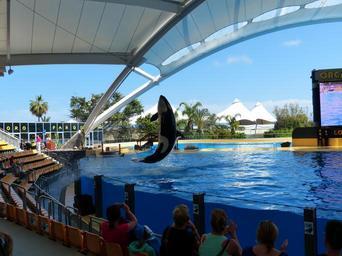 Keywords: killer whale orcinus orca orka orca wal water sea water pool swimming pool head fin animal zoo blue dangerous large tooth jump viewers grandstand