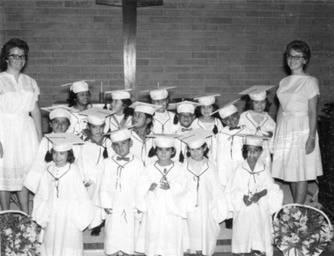 | Keywords: arizona mennoniteboardofmissions voluntaryservice graduation kindergarten children blackandwhite monochrome black and white Caption: Stanfield Mennonite Kindergarten graduation with teachers Martha Brubacher, Petosky, Mich., and Mary Slabach, Sugar Creek, Ohio. Stanfield, Arizona. 1962. Citation: Mennonite Board of Missions Photograph Collection. Mission to Arizona, 1950-1970. IV-10-7.2 Box 1 Folder 54 , photo #34. Mennonite Church USA Archives - Goshen. Goshen, Indiana. Caption: Stanfield Mennonite Kindergarten graduation with teachers Martha Brubacher, Petosky, Mich., and Mary Slabach, Sugar Creek, Ohio. Stanfield, Arizona. 1962. Citation: Mennonite Board of Missions Photograph Collection. Mission to Arizona, 1950-1970. IV-10-7.2 Box 1 Folder 54 , photo #34. Mennonite Church USA Archives - Goshen. Goshen, Indiana. |