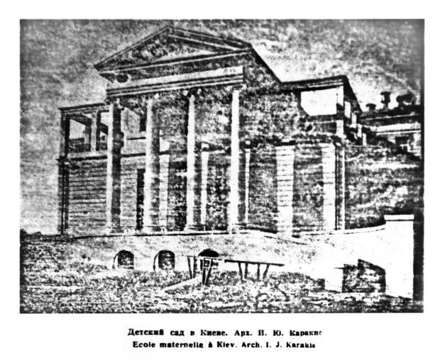 | Keywords: Kindergarten Orlenok by Joseph Yulievich Karakis - photo from 1941.jpg en First kindergarten in Kiev Ukraine Designed by architect Joseph Yulievich Karakis and named Orlenok photo from 1941 ru Пе вый детский сад го ода Киев 1939 - Детский сад 1 «О ленок» завода «А сенал» а хитекто Иосиф Юлиевич Ка акис Journal А хитекту а СССР number 2 1941 Architect Joseph Yulievich Karakis Author of the picture unknown 1941 PD-Ukraine 1940s 5 Askoldiv Lane | ||||