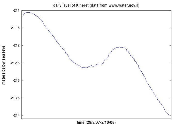| Keywords: KineretLevel.jpg  en Water level of the Sea of Galilee from March 2007 to October 2008 compiled from data on http //www water gov il/water/console/kinnert_history aspx Own anonymous scientist 10/2/08 Water level recorder in the Sea of Galilee |
