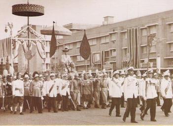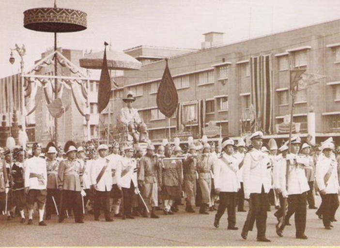 | Keywords: King Bhumbol Coronation Rajdamnern.JPG en พระบาทสม ด็จพระปรมินทรมหาภูมิพลอดุลย ดชในพระราชพิธีบรมราชาภิ ษกวันที่ 5 พฤษภาคม 2493 - วันฉัตรมงคล 1950-05-05 http //www prd go th/ewt_news php nid 147931 filename prd สำนักพระราชวัง PD-Thailand Bhumibol Adulyadej in 1950 |