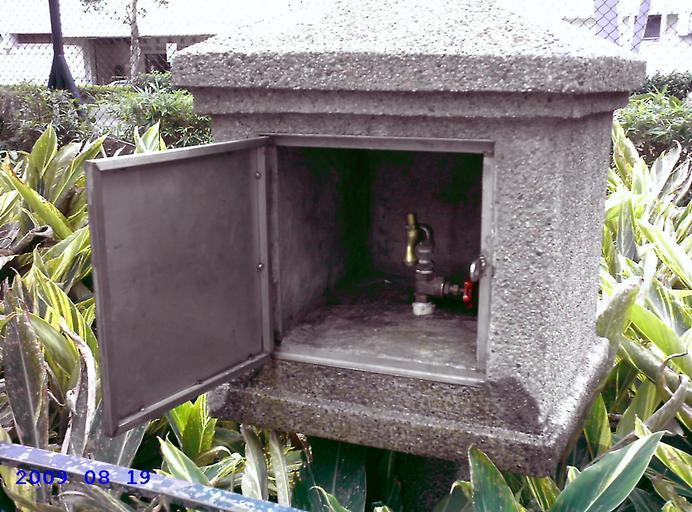 Keywords: King George V Memorial Park pavilion tap case.JPG en Water Tap Case at King George V Memorial Park Kowloon Hong Kong zh-hk 香港, 龍佐治五世 念公 裡的水龍頭箱 Own hkgalbert 2009-08-19 King George V Memorial Park Kowloon