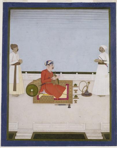 | Keywords: King Gurgin Khan.jpg Artwork Dip Chand en Gurgin Khan is shown seated on a terace and smoking from huqqa In one hand he holds a small wine cup One of the two serving attendants stands facing him and holds a tray full of small wine cups Various courtly accessories have been placed tidely in a row in front of Gurghin Khan and also his battle axe has been placxed on the floor next to him ca other date - 1760 1763 gouache paper Institution Victoria and Albert Museum London object history en he subject of this picture formerly in the Fullarton collection is most likely the Armenian cloth-merchant Gregory hence Gurghin Khan who trained Nawab Mir Qasim's troops for their engagements with the British Raymond the translator of Ghulam Husayn's history gives the following acount of him 'Gurghin-qhan was a man born at Ispahan the capital of Persia and had a very remarkable physiognomy He was above the ordinary size strong built with a very fair complexion large black eyes full of fire an aquiline nose forming a ridge in the middle of its length and eyebrows very arched that joined together so as to form a point going downwards towards the nose Nothing was wanting to that man to render him capable of shining even in Europe but education; he owed everything to his own genius and nothing to art or cultivation ' Husayn 1789 II p 503fn Information field Place of origin Murshidabad India html exhibition history en Arts of Bengal Whitechapel Art Gallery 30/12/1979-30/09/2011 credit line en The painting is in the style of the Mughal provincial court painting in particular Murshidabad school accession number D 1180-1903 http //collections vam ac uk/item/O97215/an-officer-probably-gurgin-khan-painting-dip-chand/ Gurgin Khan seated smoking on a terrace PD-Art-100 Uploaded with UploadWizard Armenians in art Smoking in art Paintings in the Victoria and Albert Museum Hookahs in art |