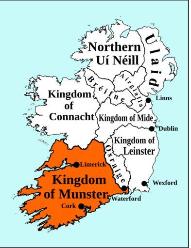Keywords: Kingdom of Munster-900.svg Created by User ZyMOS for http //historyatlas wikia com/wiki Wiki Atlas of World History Derived from en SVG map of Ireland circa 900 to accompany an article on Early Scandinavian Dublin containing place names territories and battlefields mentioned in that article Own Erigena 2009-05-14 Wiki Atlas of World History SVG maps of Ireland Maps of the history of Ireland Maps showing 10th-century history Kings of Munster |