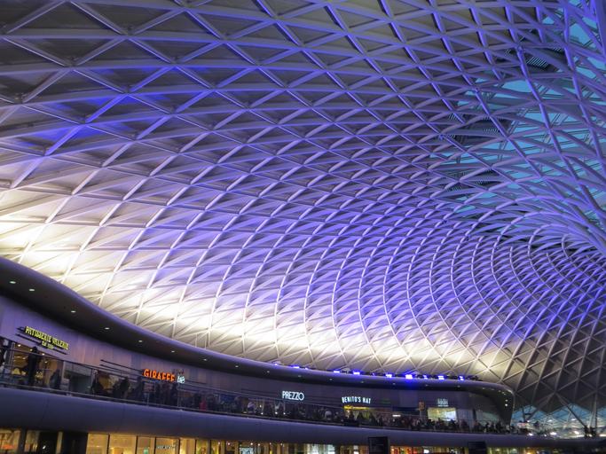 Keywords: king's cross kingscross london station railway interior roof lattice modern