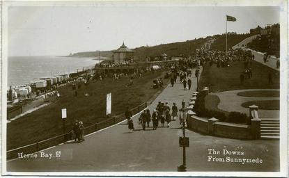 Keywords: Kings Hall HerneBay 1920s.jpg Postcard photograph of the King's Hall Herne Bay Kent England by Fred C Palmer The card is unused and undated The King's hall was built in 1904 and named the Pavilion or Bandstand until 1913 when its name was changed to King's Hall and it was rebuilt and extended underground The quality of this card and the clothes worn by the pedestrians suggest a date around 1920 and Fred C Palmer left Herne Bay by 1920 so the photo was probably taken in 1920 or just before The title The Downs from Sunnymede suggests that the postcard was manufactured for use by a bed and breakfast hotel scan of postcard in my possession 1920 or before evidence Fred C Palmer left Herne Bay by 1920 Fred C Palmer d 1941 out of copyright PD-old-70-1923 Herne Bay Kings Hall 1904-1950 Fred C Palmer of Herne Bay