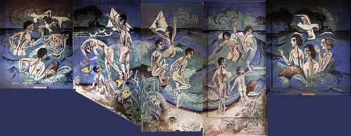| Keywords: Kirchnerwandbilder im Sanatorium Dr. Kohnstamm - 1. Weltkrieg - zusammengefuegt - bunt.JPG de Die 5 Wandbilder zusammengefügt von links nach rechts fortlaufend die durch den Treppenverlauf bedingten zum ganzheitlichen Rechteck fehlenden Teile im blauen Grundton eränzt Die 5 Wandbildteile gescannt aus dem Katalog S 226-227 Ernst Ludwig Kirchner Badeszenen im Brunnenhaus des Sanatoriums in Königstein 1916 Wandmalereien zerstört Höhe zw 229 und 440cm Farbfotografien von Franz Schilling Königstein im Taunus 1926 Städel Museum Hrsg Ernst Ludwig Kirchner-Retrospektive Ausstellungskatalog Frankfurt am Main 2010 S 226-227 Ernst Ludwig Kirchner 1880-1938 1916 PD-old Paintings of bathers by Ernst Ludwig Kirchner Oskar Kohnstamm Königstein im Taunus World War I Franz Schilling photographer |