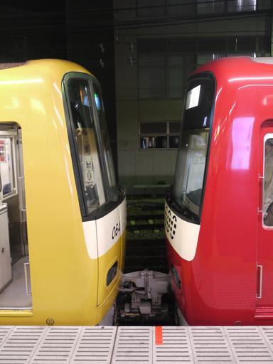 Keywords: Kissing yellow and red train.JPG en Keikyu yellow coloured train and red coloured train coupling at Kanazawa Bunko station ja 京 新1000形黄色と赤の 結 2014-09-12 18 35 29 own Hahifuheho cc-zero Uploaded with UploadWizard Keikyu 1000 series II