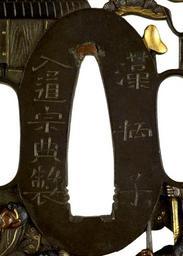 | Keywords: Kitagawa Soten - Tsuba with the Story of Shûtendôji - Walters 51299 - Mark A.jpg This tsuba may depict part of the story of Shûtendôji who was a monstrous ogre killed by Minamoto no Yorimitsu in 947 Shûtendôji was born human but his constant drinking and bad temper turned him into an ogre He and his followers devastated the area around their home and took maidens as prisoners The Emperor Murakami sent Yorimitsu also known as Raigô and four of his retainers to kill Shûtendôji They were helped in this task by the spirit of Sumiyoshi who appeared to them in the form of an old man The old man gave Yorimitsu a golden cap to wear for protection and a magical rope to bind the ogre This tsuba shows Yorimitsu and his men dressed as traveling priests while they look for Shûtendôji The tsuba is a pair with 51 300 century 19 late Edo shibuichi details of gold and copper cm 7 53 7 0 45 accession number 51 299 2398 Henry Walters Baltimore date and mode of acquistion unknown Walters Art Museum Henry Walters Acquired by Henry Walters Signature Forged Sôheishi/Nyûdô Sôten sei; Translation Made by Sôheishi Nyûdô Sôten; Place Gôshû/Hikone ju; Translation Residing in Hikone Gôshû province place of origin Japan Walters Art Museum license Tsuba in the Walters Art Museum Media contributed by the Walters Art Museum needs category review Kitagawa Soten |