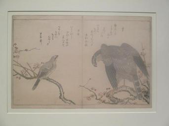| Keywords: Kitagawa Utamaro Musée Guimet.jpeg Surimono au musée Guimet datant de l'année 1791 édité par Tsutaya Jûzaburô double page issue de l'anthologie de kyôka illustrée La Myriade d'oiseaux concours de poèmes Momo Chidori Kyôka Awase Quinzième page volume II Auteur Kitagawa Utamaro 1753-1806 Impression à l'encre et couleurs légères Pie-grièche et aigle PD-old-100 Surimono in the Musée Guimet Shrikes in art Birds in art of Japan Kitagawa Utamaro | ||||