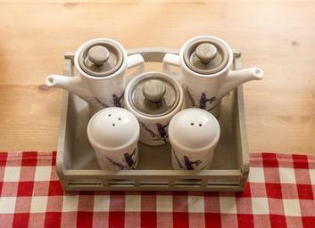 Keywords: kitchen cover decoration mesh cloth chopping board wood table cruet vinegar salt pepper oil olive oil food product photo food photo light