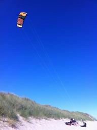 Keywords: kite blue sky beach sylt elbow fly wind summer sport kitesurfer windy kite surfing