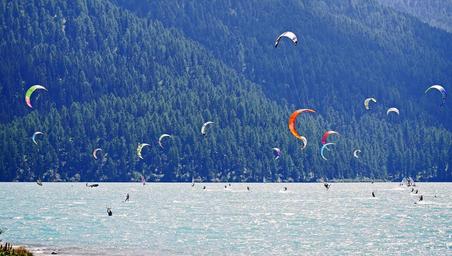 | Keywords: kite surfing wind surfing silva planner lake oberengadin sail high inntal rhätikon graubünden switzerland southwest wind steady sport surf recreational sports water sports water trend sports dynamic wind kite leisure fitness action summer floating colorful |