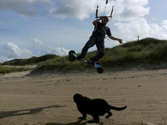 Keywords: Kiteboard.JPG en Kiteboarding on Claggan Beach Erris own Comhar 2009-05-01 Kitesurfing in Ireland Kite landboarding