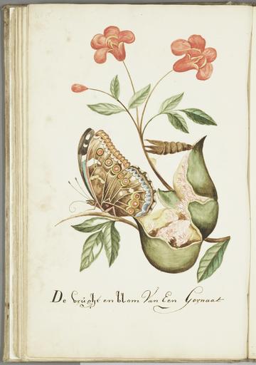| Keywords: KITLV - 37A71 - Markée, Cornelis - The fruit and flower of a pomegranate - Brush drawing - Circa 1763.tif accession number 37A71 Markée Cornelis credit line Collection Markée Cornelis nl De vrught en blom van een gernaat en The fruit and flower of a pomegranate 38 x 24 cm exhibition history Universiteitsbibliotheek Leiden Koninklijk Instituut voor Taal- Land- en Volkenkunde nl Penseeltekening en Brush drawing Keywords butterflies - insects - Suriname - trees object history origin object type PD-old-100-1923 KITLV donation place of creation place of discovery Pictures of the tropics a catalogue of drawings water-colours paintings and sculptures in the collection of the Royal Institute of Linguistics and Anthropology in Leiden / by J H Maronier - 's-Gravenhage Nijhoff 1967 - p 99 Een kopie naar/A copy after 'Metamorphosis Insectorum Surinamensium ofte verandering der Surinaamsche insecten waar in de Surinaamsche rupsen en wormen met alle des zelfs veranderingen na het leven afgebeeld en beschreven worden ' / door Maria Sybilla Merian - Amsterdam Valck 1705 2 60 p 61 pl - ill - Plaat IX http //media-kitlv nl/all-media/indeling/detail/form/advanced q_search_signatuur 37A71 Leiden University Library KITLV image 37A71 http //media-kitlv nl Homepage media-kitlv nl KITLV Uploaded with GWToolset KITLV_-_37A71_-_Markée _Cornelis_-_The_fruit_and_flower_of_a_pomegranate_-_Brush_drawing_-_Circa_1763 https //socrates leidenuniv nl/wikiMedia/37A71 tif Media contributed by KITLV Artwork by Cornelis Markée from KITLV Unidentified Lepidoptera illustrations Works after Maria Sibylla Merian |