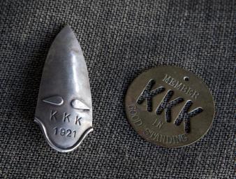 | Keywords: KKK metals 07669u original.jpg Two KKK metals on fabric underground 2010-05-22 digital colour photograph object history credit line The George F Landegger Collection of Alabama Photographs in Carol M Highsmith's America Library of Congress Prints and Photographs Division left metal KKK 1921 <br> right metal MEMBER KKK IN GOOD STANDING accession number LC-DIG-highsm- 07669 ONLINE P P LOC-image highsm 07669 PD-Highsmith History of the United States Ku Klux Klan | ||||