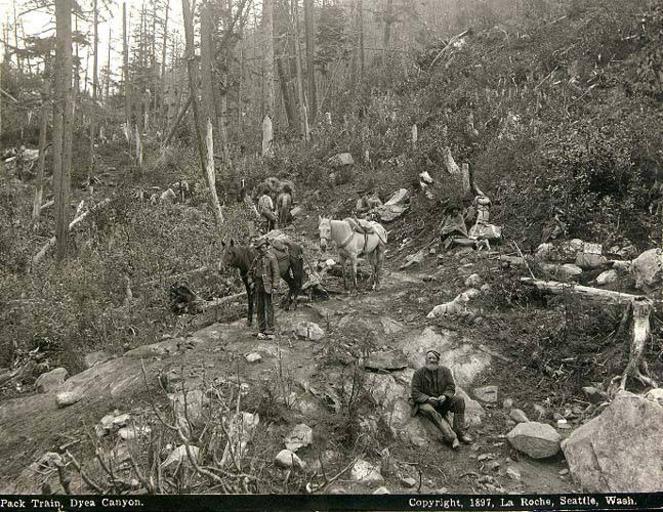 | Keywords: Klondikers with packtrain on the Chilkoot Trail, Alaska, 1897 (LAROCHE 118).jpeg check categories 8 June 2016 4 Photograph Creator Frank La Roche Caption on image Pack train Dyea Trail c1897 Pack train Dyea Canyon This is a magnificient piece of scenery if regarded purely from a natural point of view The unrestrained elements have produced a state of chaos; and through the wooded gulch the human trail wends its way and man in quest of wealth and honor defies the forces of nature Great boulders of rock and piles of broken timber bestrew the line of march and great care has to be exercised in picking out one's footsteps and also those of the beasts of burden Accidents are not by any means a rarity; but with the necesary amount of care there is no occasion for any serious mishaps unless the weather be unpropious Fine weather prevailed when this photograph was taken Frank La Roche En Route to the Klondike 1898 Klondike Gold Rush Subjects LCTGM Pack animals--Alaska; Horses--Alaska Subjects LCSH Chilkoot Trail; Trails--Alaska depicted place Alaska 1897 Institution University of Washington UWASH-LAROCHE-source accession number laroche 118 PD-old-auto-1923 1936 Information field Order Number LAR259 Images from the Frank La Roche Photographs Collection to check Pack animals Horses Chilkoot Trail Trails |