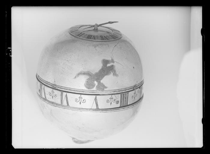 Keywords: Klotur - Livrustkammaren - 35359.tif Klotformigt ur med loddrift där urhuset utgör lodet Sammansatt av tre delar 1 undre halvan av slät förgylld koppar blytyngd på bottnens insida på utsidan cirkelformig tavla av mässing med sifferring av silver graderad I-XII visare av stål I överkanten 4 hål för fastskruvning av urveket 2 Övre halvan likaså av förgylld koppar upptill hank med nitade öglor allt av mässing Vid hanken 4 skruvhål samt rektangulärt hål 13x7 mm <br/><br/>I nederkanten rund silverplatta graderad 1-3 4 syns ej med hål för uppdragningsaxel 3 Urverk nästan helt av mässing med roterande förgylld sifferring graderad I-XII synlig mellan de två halvorna visare i form av ängel fastskruvad vid nedre halvan Uret hänger i vaxat snöre upplindat runt spiralaxel i snörets andra ände tillplattad oval ring av mässing På övre halvan märkning med röd färg 3937 original caption klotur - LRK 191 ca 1700 steel - silver - brass - copper - lead g 1251 size mm 119 108 LRK Stanislaus I av Polen kung Människan och tiden 1989 Människan och tiden 1990 Kunglig tid 1999 place of origin original filename LN_B08274_011154 36768 inventory number LRK 191 35359 CC0 Klotur - Livrustkammaren - 35359-negative tif Media contributed by LSH without any categories Media contributed by LSH unmatched objKeyword Media contributed by LSH 2013-10 |
