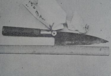 Keywords: Knife of Yakai incident.JPG 八海事件の凶器とされた包丁 2014-05-13 14 48 58 正 ひろし 察官 神の名において 司法殺人は許されるか 光文社 カッパ・ブックス 1956年 85頁 author Custom license marker 2014 05 13 PD-Japan-oldphoto Uploaded with UploadWizard Yakai incident Japanese kitchen knives