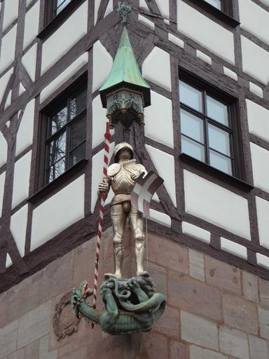 Keywords: knight dragon middle ages old town facade truss fachwerkhaus georg architecture building city nuremberg renovated