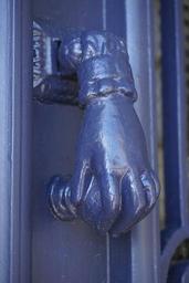 Keywords: knocker handle hand metal urban design door city entée color