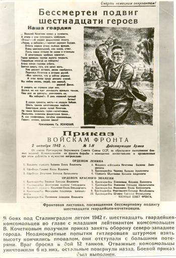 | Keywords: Kochetkov leaflet.jpg  ru Ф онтовая листовка посвящённая подвигу В Д Кочеткову и его подчинённым Листовка издана в 1942 году во в емя Сталинг адской битвы 2014-10-16 11 09 59 http //www penza-km ru/ Пензенский областной к аеведческий музей файл п едоставил ди екто музея Зименков В  author файл п едоставил ди екто музея Зименков В  для  азмещения в википедии other versions Custom license marker 2014 10 16 PD-Russia Uploaded with UploadWizard Battle of Stalingrad People associated with World War II from the Soviet Union Kochetkov Vasily Dmitrievich |