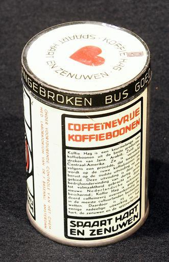 Keywords: Koffie Hag bus, foto 4.JPG Very old packaging of a Dutch product that is not produced and not sold any more Photographed at a collector of Droste For info see http //www tincollectors nl/ tincollectors nl or email info tincollectors nl own 2014-04-11 09 24 20 Alf van Beem CC-Zero Trademarked Coffee tins