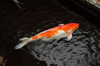 Keywords: Bright orange and white koi in an indoor pond orange white fish water fountain big pond large indoors koi manmade carp atrium fins