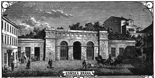 Keywords: Konska brana.jpg cs Vyobrazení Koňské brány v časopise Světozor v roce 1874 číslo 38 strana 449 Nakreslil F Biza own Radek Linner 1874 PD-old History of Wenceslas Square