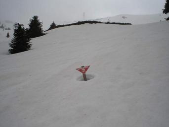 Keywords: Kop mine mines.jpg MINES warning sign about NATO cluster bombs near ski slopes Picture taken in spring 2006 CrniBombarder Kopaonik 1999 NATO bombing of Yugoslavia Cluster bombs