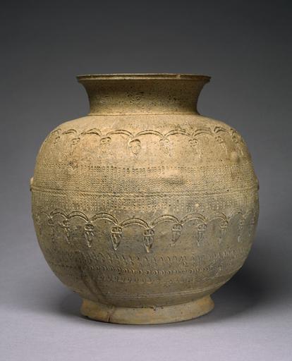 | Keywords: Korean - Stamped Jar - Walters 492764 - Profile.jpg  The jar is of spherical form supported on a splayed foot and surmounted by a high flared neck Two thin scrolled coils are applied opposite each other at the midsection pressed with enough force to make a slight indentation Two stamped rows of scalloped borders and cicada-like motifs with heart-shaped bodies enclosing multi dot bands encircle the body A series of zig-zag crescent and line border are stamped and carved above the foot The neck is stamped with trailing trefoil motifs above radiating lines of multi-dots on the shoulder Some of the stamped jars that have been found in tombs were used as urns in accordance with the Buddhist preference for cremation Buddhism had become the official religion of the Silla period in 528 century 8 9 Unified Silla stoneware cm 23 5 23 diam accession number 49 2764 18163 Alice Boney New York date and mode of acquisition unknown Unknown family upstate New York by purchase ca 1950 - 1959 Kaikodo Asian Art Gallery New York NY Carol Conover Kaikodo NY 1997 by purchase Friends of the Asian Collection by purchase Walters Art Museum Gift of the Friends of the Asian Collection 1999 place of origin Korea Walters Art Museum license Art of Korea in the Walters Art Museum Art of Korea Media contributed by the Walters Art Museum needs category review |