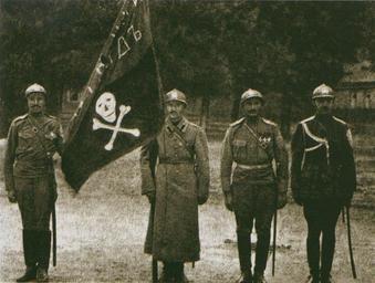 | Keywords: Kornilovzy.jpg en Banner of Kornilov's death unit ru Знаменосец и почётный ка аул Ко ниловского уда ного от яда Scanned image of foto made in Eastern Front of WWI in 1917 Author 1917 Color guards of Russia Flags with skulls Flags of Kornilov Shock Regiment Military people with flags of Russia Military uniforms of the White movement Photographs of military flags of Russia Russia in World War I Skull and crossbones military symbol PD-old | ||||