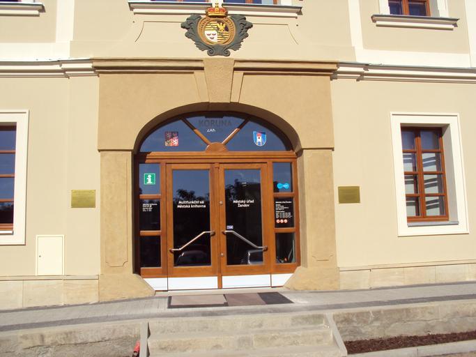 | Keywords: Koruna Žandov detail.jpg cs Vchod do historického domu Koruna na náměstí od podzimu 2010 radnice města Žandov nad vchodem erb zákupské kněžny own Zákupák 2010-10-08 50 42 50 221 N 14 23 47 607 E region CZ Žandov Česká Lípa District Town halls in Česká Lípa District |