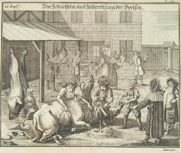 Keywords: food preparation foodpreparation ritesandcustoms ritesandceremonies jewish jews leobaeckinstitute architecture monochrome Description: Illustration from Juedisches Ceremoniel, a German book published in 1724. The book is a beautifully illustrated description of Jewish religious ceremonies, rites of passage and feast days, which first appeared in 1716, here in its second edition of 1724. The extremely detailed plates, by Georg Puschner, depict priestly robes, the celebrations of the New Year, Passover, the weekly Sabbath, circumcision, presentation of the first born, prayer at the synagogue, a wedding procession and a wedding, purification of the bride, the washing of the brother-in-law's feet, the feast of reconciliation, death rites, burials, as well as the procedures for other Jewish customs. Read the entire book Creator: Kirchner, Paul Christian Creator: Jungendres, Sebastian Jacob, 1684-1766 Creator: Puscher, Georg Object Origin: Nürnberg, published by Peter Conrad Monath Persistent URL: digital.cjh.org/R/?func=dbin-jump-full&amp;object_id=139313 Repository: Leo Baeck Institute, 15 West 16th Street, New York, NY 10011 Call Number: r BM 700 K57 1724 Rights Information: No known copyright restrictions; may be subject to third party rights. For more copyright information, click here. See more information about this image and others at CJH Digital Collections. Digital images created by the Gruss Lipper Digital Laboratory at the Center for Jewish History Description: Illustration from Juedisches Ceremoniel, a German book published in 1724. The book is a beautifully illustrated description of Jewish religious ceremonies, rites of passage and feast days, which first appeared in 1716, here in its second edition of 1724. The extremely detailed plates, by Georg Puschner, depict priestly robes, the celebrations of the New Year, Passover, the weekly Sabbath, circumcision, presentation of the first born, prayer at the synagogue, a wedding procession and a wedding, purification of the bride, the washing of the brother-in-law's feet, the feast of reconciliation, death rites, burials, as well as the procedures for other Jewish customs. Read the entire book Creator: Kirchner, Paul Christian Creator: Jungendres, Sebastian Jacob, 1684-1766 Creator: Puscher, Georg Object Origin: Nürnberg, published by Peter Conrad Monath Persistent URL: digital.cjh.org/R/?func=dbin-jump-full&object_id=139313 Repository: Leo Baeck Institute, 15 West 16th Street, New York, NY 10011 Call Number: r BM 700 K57 1724 Rights Information: No known copyright restrictions; may be subject to third party rights. For more copyright information, click here. See more information about this image and others at CJH Digital Collections. Digital images created by the Gruss Lipper Digital Laboratory at the Center for Jewish History <strong>Description: </strong>Illustration from Juedisches Ceremoniel, a German book published in 1724. The book is a beautifully illustrated description of Jewish religious ceremonies, rites of passage and feast days, which first appeared in 1716, here in its second edition of 1724. The extremely detailed plates, by Georg Puschner, depict priestly robes, the celebrations of the New Year, Passover, the weekly Sabbath, circumcision, presentation of the first born, prayer at the synagogue, a wedding procession and a wedding, purification of the bride, the washing of the brother-in-law's feet, the feast of reconciliation, death rites, burials, as well as the procedures for other Jewish customs.