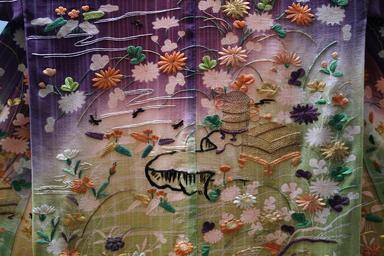 | View Original: | Kosode (garment with small wrist openings), view 3, Edo period, 19th century, stream, flowing plant, house and insect cage design on purple and light green tussah silk crepe ground - Tokyo National Museum - DSC06002.JPG (5472x3648) | |||