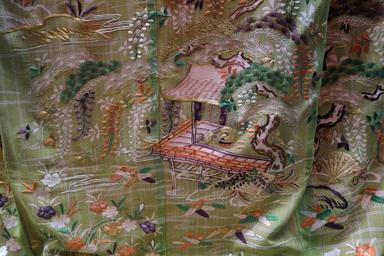 Keywords: Kosode (garment with small wrist openings), view 4, Edo period, 19th century, stream, flowing plant, house and insect cage design on purple and light green tussah silk crepe ground - Tokyo National Museum - DSC06004.JPG en Exhibit in the Tokyo National Museum Tokyo Japan This artwork is old enough so that it is in the public domain 2013-09-03 00 26 20 own Daderot cc-zero Kosode in the Tokyo National Museum Uploaded with UploadWizard Crepes fabric