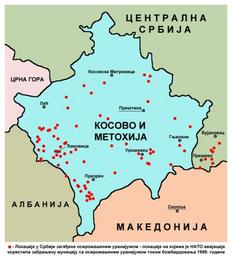 | Keywords: Kosovo uranium NATO bombing1999-sr.png en Sites in Kosovo and southern Central Serbia where NATO aviation used depleted uranium rounds during 1999 bombing sr Локације на Косову и југу Цент алне С бије на којима је АТО авијација ко истила заб ањену муницију са оси омашеним у анијумом током бомба довања 1999 године own PANONIAN 2014 Cc-zero References http //www jacksonprogressive com/issues/kosovo/chossudovsky_lowintensity html http //www jacksonprogressive com/issues/kosovo/targeted gif http //mondediplo com/IMG/arton2045 gif http //www journal forces gc ca/vo4/no1/research-recherch-eng asp http //kosova org/pics/maps/dukosom gif http //www srpskapolitika com/Nato/nato-genocid html http //www spc rs/sr/tajne_oruzja_sa_osiromasenim_uranijumom Večernje Novosti Utorak 18 maj 2010 strana 5 Maps of the history of Kosovo in modern times Maps of the history of Serbia in modern times Maps of the Yugoslav wars Kosovo War 1999 NATO bombing of Yugoslavia War crimes Depleted uranium Maps in Serbian |
