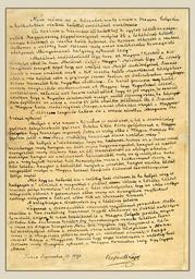 | Keywords: Kossuth written text arad speech.jpg hu Kossuth saját kézzel Ãrt beszéde az aradi emlékmű avatására http //mek oszk hu/kiallitas/kossuthhangja/html/nyito htm http //www americanhungarianfederation org/images/AHFHistory/kossuth_written_text_arad_speech jpg Lajos Kossuth 1890 Nem néma az a kÅ‘szobor mely amott a magyar Golgotán a halhatatlan vértanú halottak emlékének emeltetett Én hozzám a kitaszitott élÅ‘ halotthoz ki egykor zászlótartója valék Magyarország függetlenségének melyért Å‘k a lehóhérolt hÅ‘sök annyit küzdöttek és mártir halált haltanak én hozzám elhozták a multak szellemei a velÅ‘kig ható szózatot mely amaz emlékszobor kimagasló alakjának Hungariának halgatag ajkairol zeng žHazádnak rendületlenül légy hive oh magyar tiszteld a kit tisztelet illet de hive Hazádnak érted e magyar Hazádnak légy Ne csinálj magadnak faragott képet hogy azt imádjad csak Hazád szabadságának Istenét imádd a mint imádták azok a kik mártÃr halált szenvedtenek hűségükért ahoz a mit haláluk után a jog ereje iránti hitben az önbizalomban megfogyatkozott nemzedék hite hagyottan elalkudott Én hazád géniusza hirűl vittem megdicsőült szellemeknek oh magyar hogy kegyelettel adózol emléküknek válaszúl azt hozom neked tÅ‘lük hogy ez jól vagyon de tartsad eszedben hogy a Kegyelet érzelmeinek virága meddÅ‘ szóvirág volna ha hűsége nem fejlÅ‘dnék az iránt a miért Å‘k földi életüket feláldozák Az Å‘ Istenük a magyar haza szabadságának Istene annak oltárához várják a magyart E szózat zengését hallom én a messze távolban Hungaria szobrának ajkairol Hallják e ezt amott a közelben is mind azok a kik a szivrázólag gyászos felejthetetlenül gyászos October 6kán összegyülekeznek a magyar Golgotán hogy tanúságot tegyenek Isten és világ elÅ‘tt a magyar nemzet Kegyelete felÅ‘l a Haza szabadság harczának szent emlékei iránt Ha hallják e Lehetetlen hogy ne hallanák; hiszen az a Szózat annak visszhangja mely hangzik az Å‘sök szent hagyományaibol hangzik az utódok esengésébÅ‘l mely számon kéri az élÅ‘ nemzedéktÅ‘l az elidegenithetetlen örökséget hangzik az emlékezesek lüktetésébÅ‘l mely az éj csendjében haza jár a meghajlott derekak háló kamarájába mint a lelkiismeret szava a bűn lakába; hangzik a bölcsÅ‘kböl hangzik a sirokból hangzik minden fűszál rezgésébÅ‘l melyet a magyar hazának honfivér özönével termékenyitett földje táplál Hát hogy ne hallanák azt a velÅ‘kig ható szózatot; de ha hallják meg is hallgatják e elviszik e magukkal e szózat ihletét a közélet küzdelmeinek pálya homokára elviszik e házi tüzhelyeikhez hogy az ihlet csillaga világitson elÅ‘ttük a gyermekeik elÅ‘tt mint az evangéliom mythikus csillaga világitott a bölcsek elÅ‘tt kik az idvezitÅ‘t keresék Hangfelvétel innen A világ birája a történelem fog e kérdésre felelni Legyenek a szentemlékű vértanúk megáldottak poraikban szellemeikben a hon szabadság Istenének legjobb áldásaival az örökké valóságon keresztűl; engem ki nem borúlhatok le a magyar Golgota porába engem October 6ka térdeimre borúlva fog hontalanságom remete lakában látni a mint az engem kitagadott Haza felé nyujtva agg karjaimat a hála hÅ‘ érzelmével áldom a vértanúk szent emlékét hűségükért a Haza iránt 's a magasztos példáért melyet az utódóknak adtanak; 's buzgó imával kérem a magyarok Istenét hogy tegye diadalmassá a velÅ‘kig ható szózatot mely Hungária ajkairol a magyar nemzethez zeng Úgy legyen Amen Turin September 20 1890 Kossuth Lajos PD-old Lajos Kossuth The 13 Martyrs of Arad Freedom monument Arad Emigrants from Hungary Signatures of Lajos Kossuth Handwriting in Hungary Letters of Hungary |