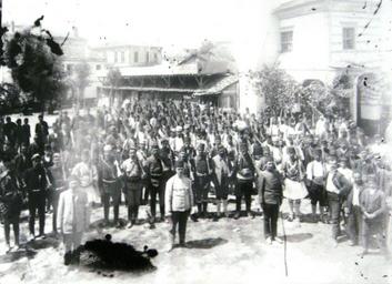 | Keywords: Kosturski garnizon privrzanici na Mladoturskata revolucija.jpg mk Косту скиот га низон на чело со уфта бег п виот од десно во п виот ед п и доаѓањето во Битола за в еме на ладоту ската еволуција Битола 1908 оштетена плоча en Kostur garrison headed by Myftari Bey first from right in front row on the arrival in Bitola during the Young Turk revolution Bitola 1908 Damaged glass plate DARM archive 1908 The State Archives of the Republic of Macedonia DARM Bitola Department Creator Yanaki and Milton Manaki other versions Custom license marker 2016 09 26 PD-Macedonia Wikipedian in Residence at DARM Photographs by Manaki Brothers Young Turk Revolution |