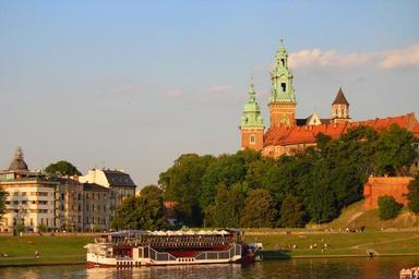 Keywords: krakow river poland castle campanile houses water boat blue sky bricks tourism europe