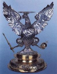 | Keywords: Kremlin Armoury 2.jpg Artwork en Polish Eagle - heraldic base for a royal crown pl Polski Orzeł - heraldyczna podstawa pod koronę królewską Silver gilt cm 89 Moscow Kremlin Armoury en The flat plate at the top of the eagle's head served as a stand for a royal crown Object history ca 1665 commission John II Casimir of Poland Warsaw ProvenanceEvent 1671 gift Alexis I of Russia Moscow Michael Korybut of Poland Warsaw own BurgererSF MZ 191 1665-1666 Abraham I Drentwett eagle Heinrich Mannlich base Other versions White Eagle of Poland by Abraham Drentwett I |