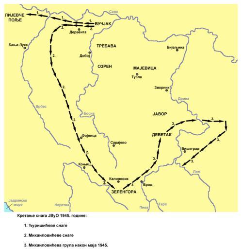 | Keywords: Kretanje snaga jvuo 1945.png en Movement of JVuO troops Đurišić and Mihailović column in spring 1945 sr Kretanje snaga JVuO Đurišićeve i Mihailovićeve kolone u proleće 1945 own PANONIAN 2013 Cc-zero References Made according to this source http //www znaci net/00001/40_83 htm http //www znaci net/images/20519 jpg Maps of Yugoslavia during World War II Maps of the history of Bosnia and Herzegovina in modern times Maps of the history of Republika Srpska Maps of Serbia during World War II Maps in Serbian Chetniks during World War II |